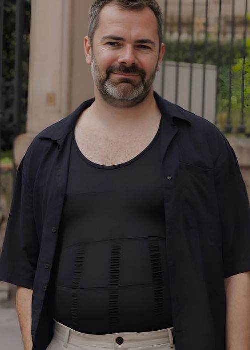 MenFit est né de cette idée. Un débardeur invisible sous les vêtements, ultra confortable, qui lisse le ventre et le torse instantanément.